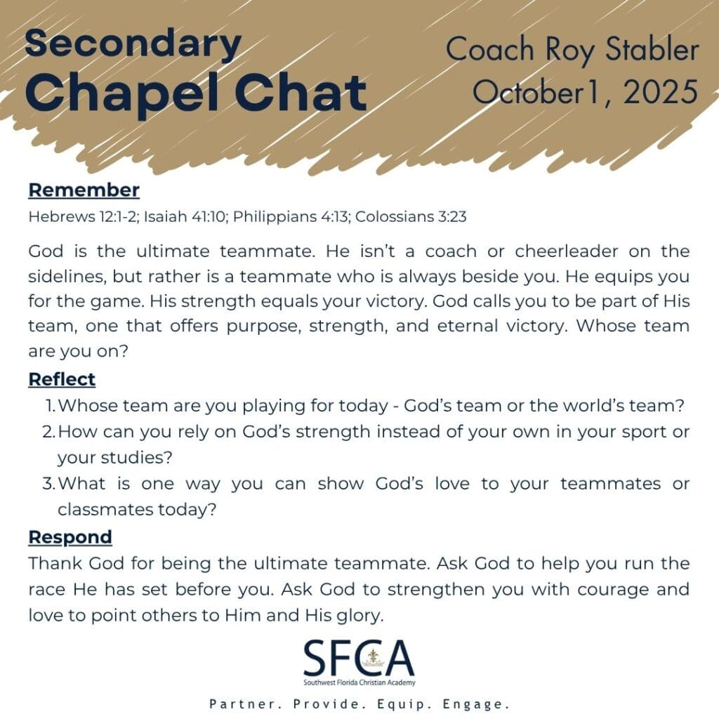 Coach Roy Stabler (SFCA) reminded Secondary students that God is the ultimate teammate and challenged them to live as part of His team.