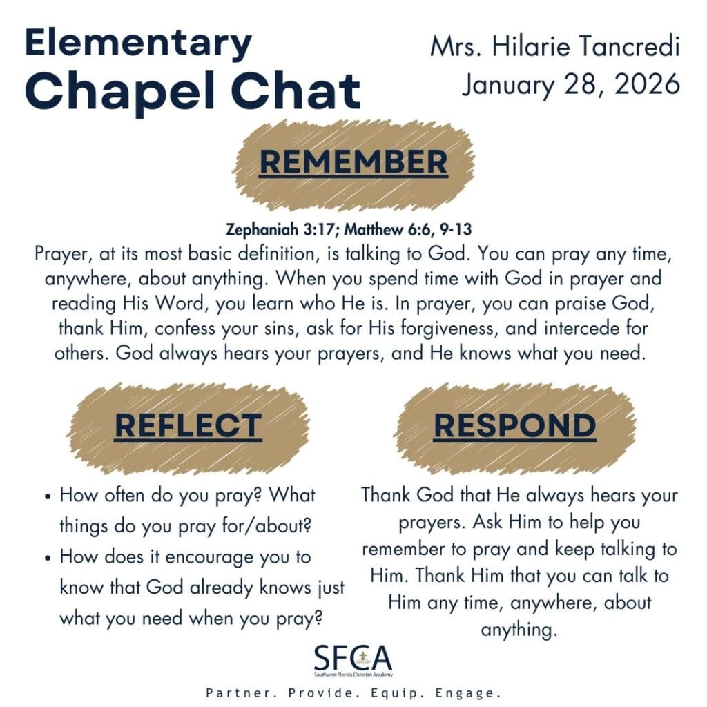 Mrs. Hilarie Tancredi (McGregor Baptist Church, Children’s Ministry Administrative Assistant) reminded Elementary students that we can pray any time, anywhere, about anything!
