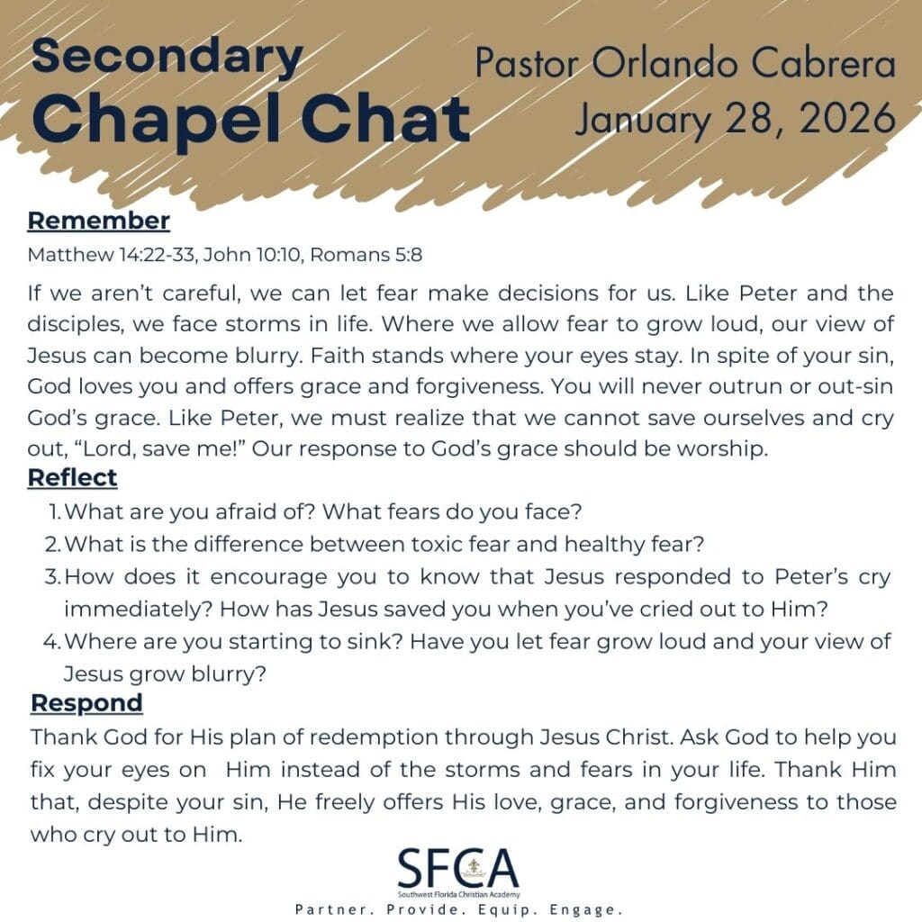Pastor Orlando Cabrera (Summit Church, University Campus Pastor) reminded Secondary students to fix their eyes on Jesus instead of on their fears.
