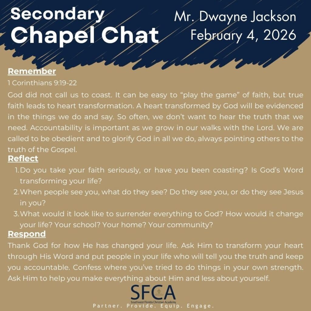 Mr. Dwayne Jackson (Hoops on Mission) shared his story with Secondary students, reminding them that God does not call us to coast but to live transformed lives for the sake of the Gospel.